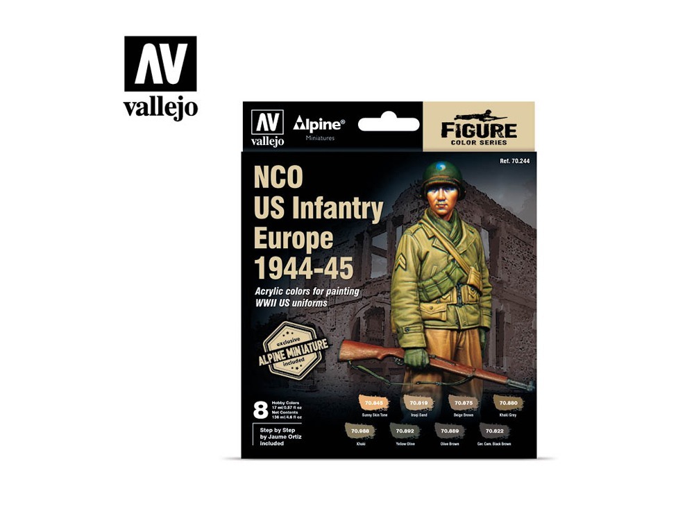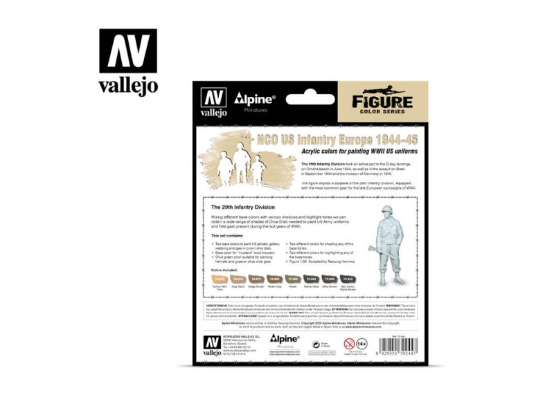The Vallejo US Alpine Infantry NCO & Figure Set is part of the Vallejo Figure Color Series and features a highly detailed 1/35 scale miniature sculpted by Teasung Harmms. This set depicts a corporal of the 29th Infantry Division, equipped with the typical gear used during the European campaigns of WWII (1944–1945), including the D-Day landings at Omaha Beach and the assault on Brest. Perfect for historical miniature painters, the set includes 8 Model Color acrylic paints to accurately recreate uniforms, gear, and accessories.