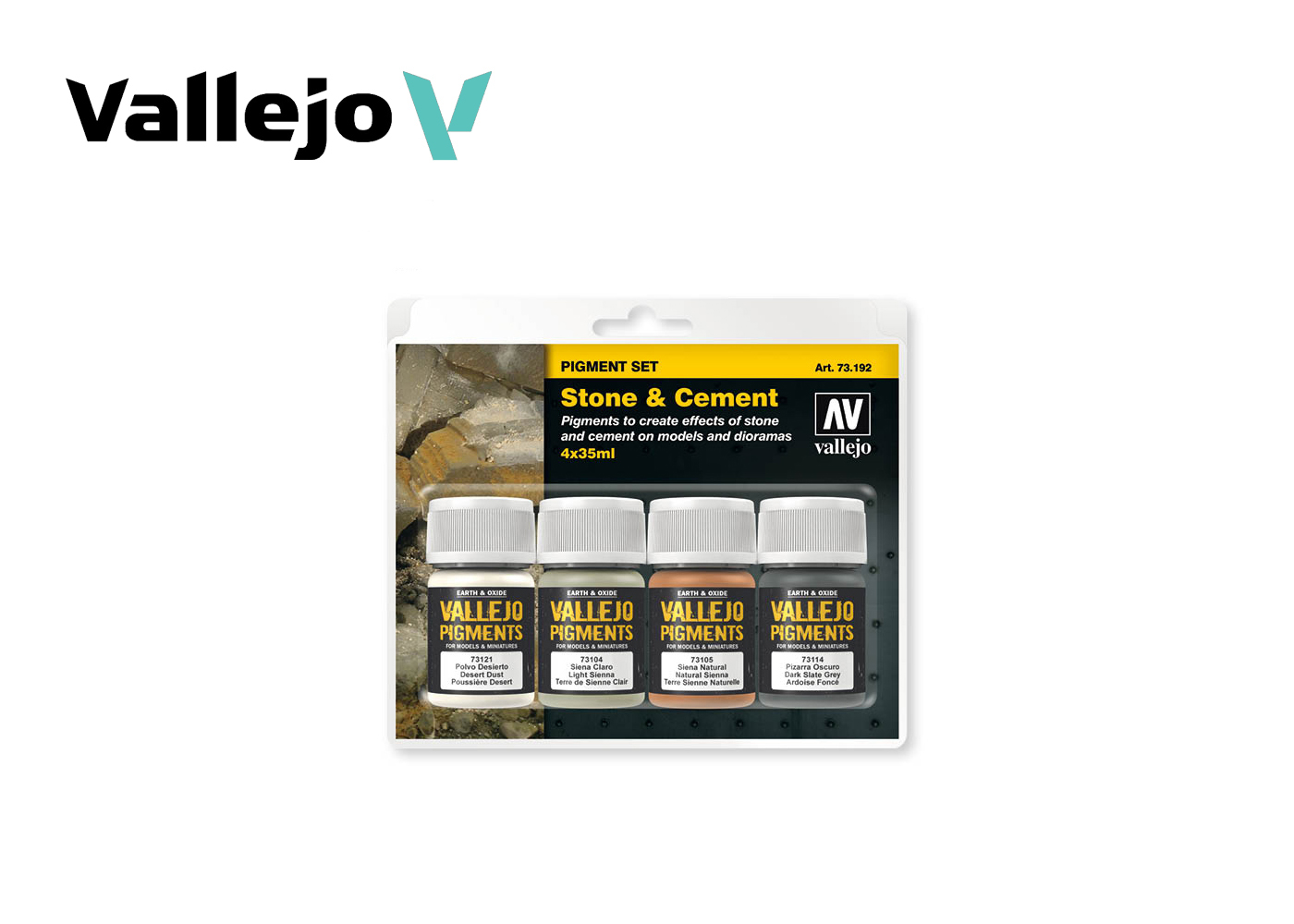 This Vallejo Pigment set includes a step by step guide by Chema Cabrero to assist in creating the effects of stone and cement on models and dioramas.