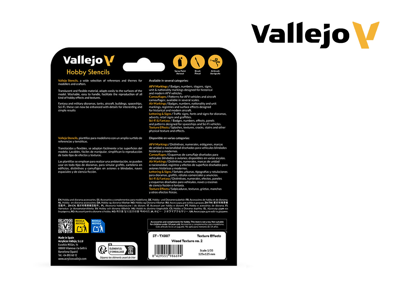 Vallejo Stencils are specially designed to help modelers and painters achieve realistic surface details and effects with ease. Made from translucent, flexible material, these stencils adapt seamlessly to flat, curved, or irregular surfaces, making them ideal for a wide range of hobby applications.
